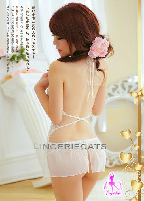 ◆Description:Blossom in her secret garden. Criss-cross at back. Ties at neck. Back closure at hip. Comes with matching G-string. One size fits most.