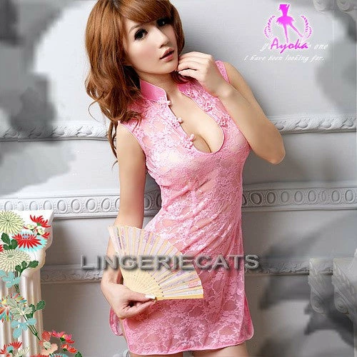 ◆Description: Hot lace Chinese cheongsam costume lingerie set with keyhole & side splits.