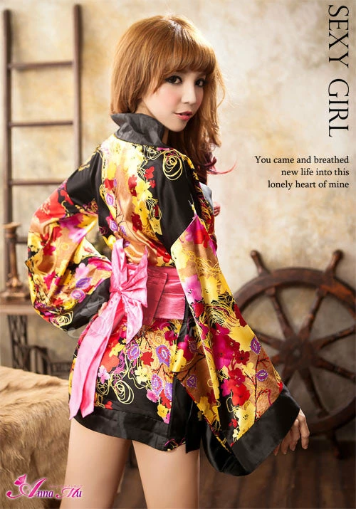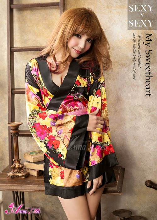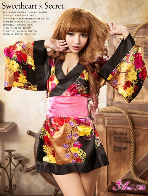 Anna Mu Lingerie Set LINGERIECATS Black Lace Pink Hibiscus 3pcs Japanese Kimono Costume Set