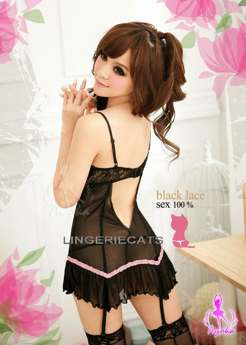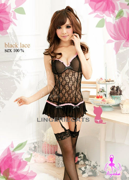 Anna Mu Lingerie Set LINGERIECATS Black Lace Pink Hibiscus 3pcs Japanese Kimono Costume Set