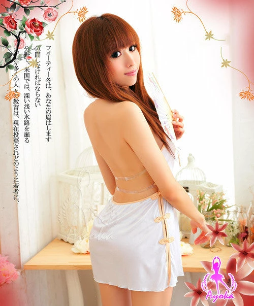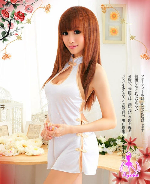 Description : Gorgeous Chinese cheongsam costume with classic keyhole design and mandarin buttons at the sides. Comes with matching G-sting and adjustable clear bra straps. Make you look so attractive under this appealing cheongsam.