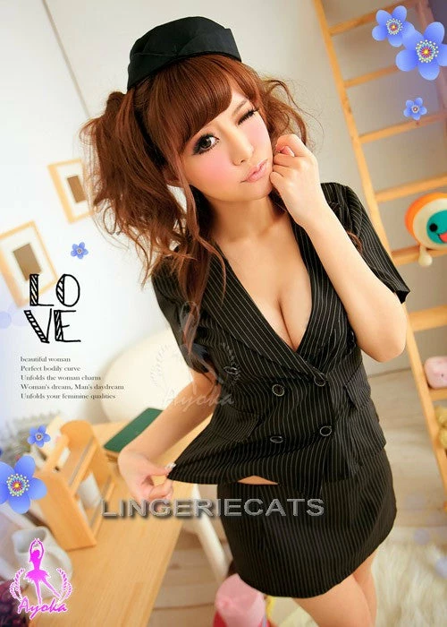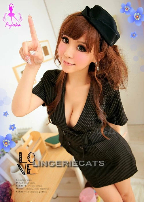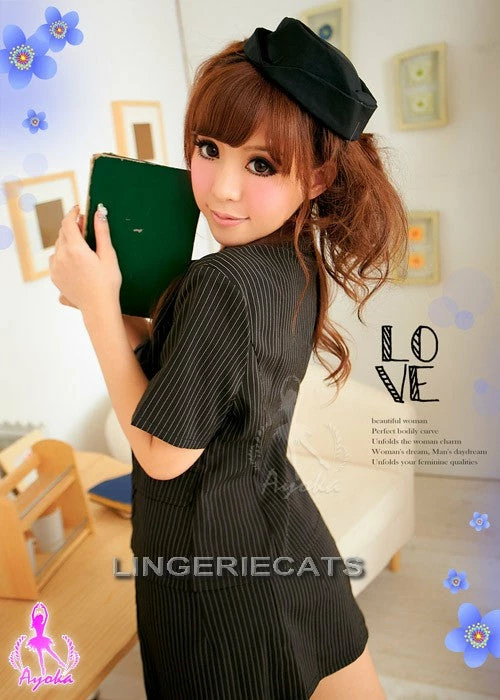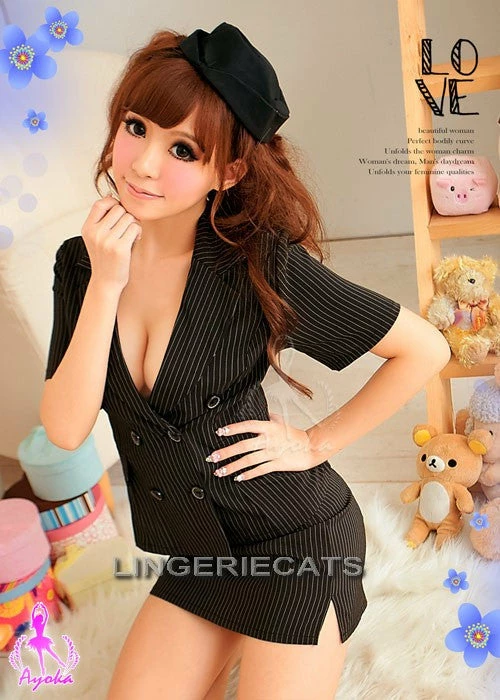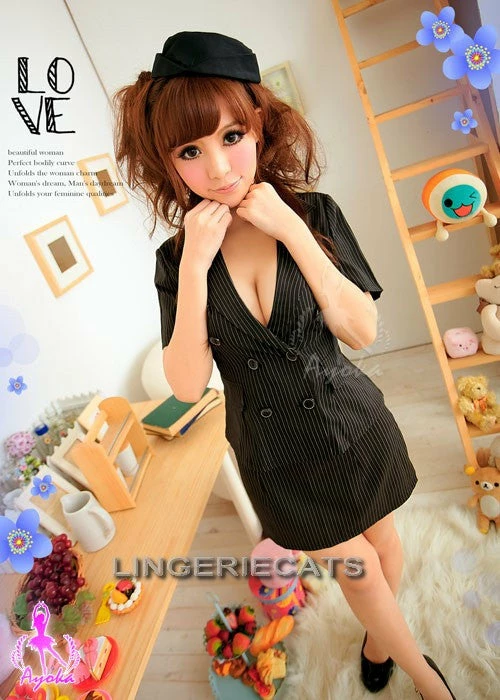 ◆Description:Let me fulfill your fantasy! Deep V-neckline cutting and fitted button-front top. Sexy miniskirt with hidden zipper. Comes with a hat and turns you into another sexy flight attendant look.