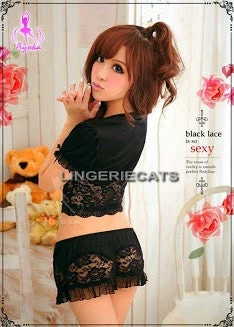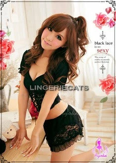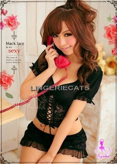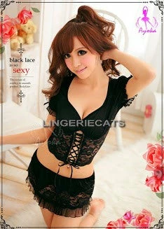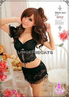 Description: Pray this unforgettable moment can be lasting forever! Really lovely top trimmed with lace and lace-up, letting your waist look slim. Comes with sexy skirt and matching thong.