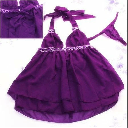 | Item Material: Satin Item color: Purple (As pictures show) Item condition: 100% Brand new Size: One size fit most women and girl One set: Dress, G-string |